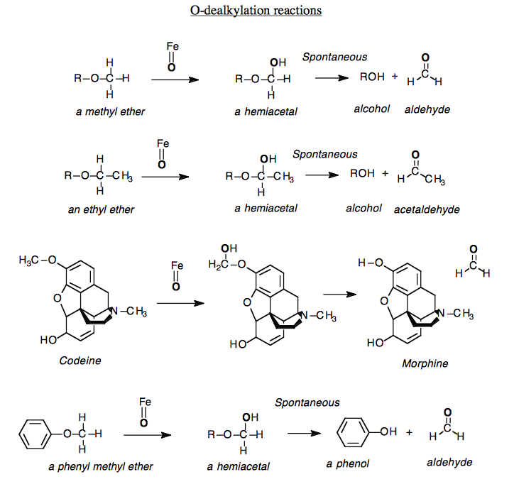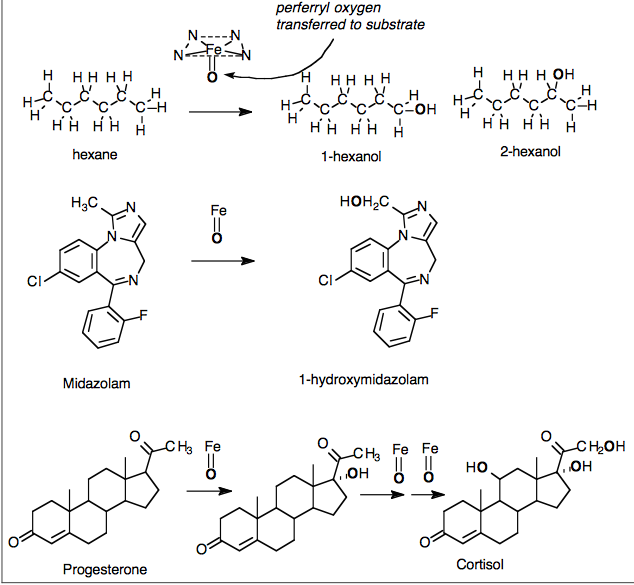 Oxidation of sp3 carbon-hydrogen bonds, O-dealkylation, N-dealkylation, oxidation of sp2 carbon-carbon bonds, oxidtion of double bonds in aromatic systems to make arene oxides and phenols.