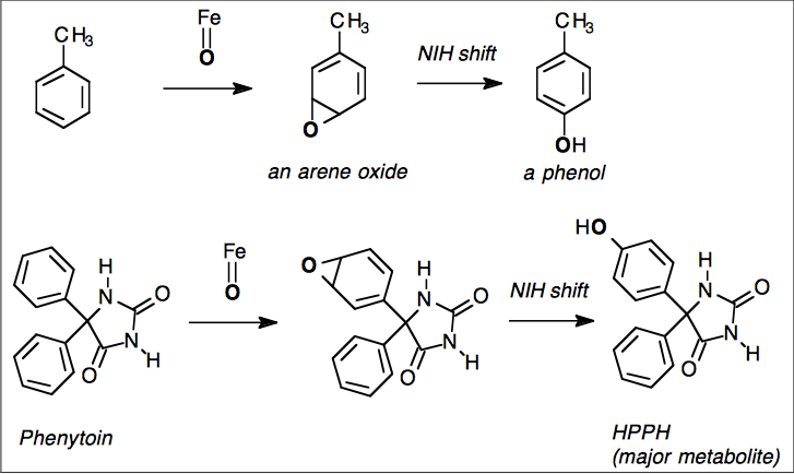 arene oxide rapidly rearranged by NIH shift to phenol.