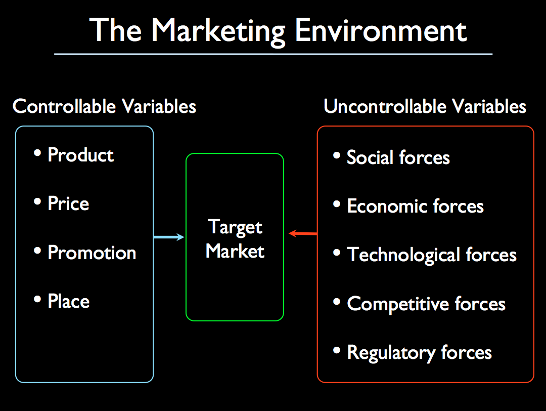 _________ helps us understand the demographics of a marketplace, while _________ tells us how to position, promote, design, distribute, and price the products.