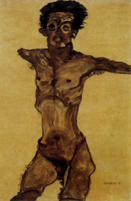 Egon Schiele, Nude Self-Portrait in Gray with Open Mouth, 1910, gouache and black crayon on paper