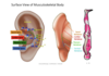 Whole of Body represented on the Microsystem in Upside Down pattern for distal locations on the ears, hands, and feet.