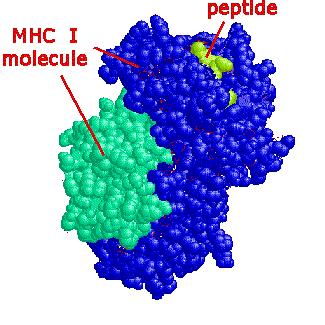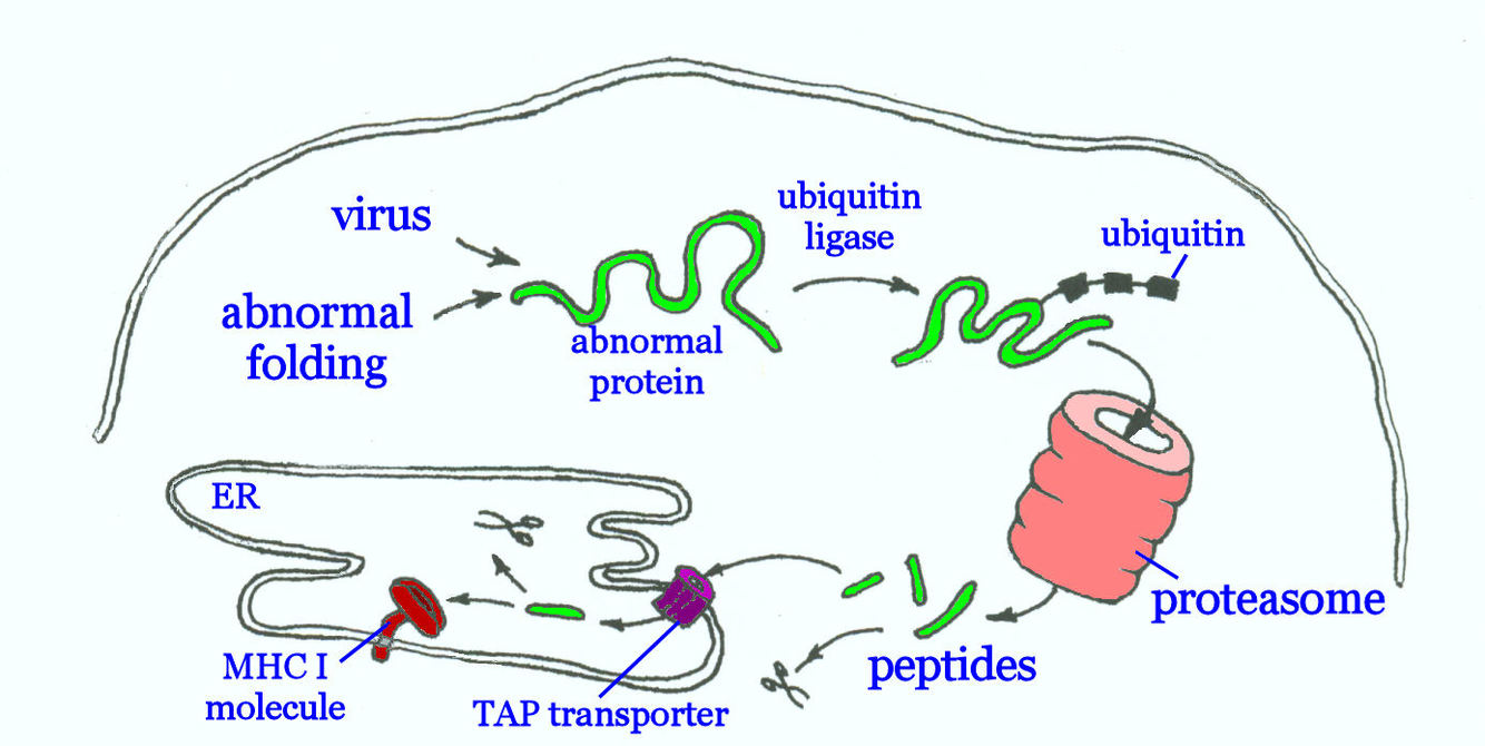 Steps from protein in cell to being expressed in MHC I molecule on the surface of the cell.