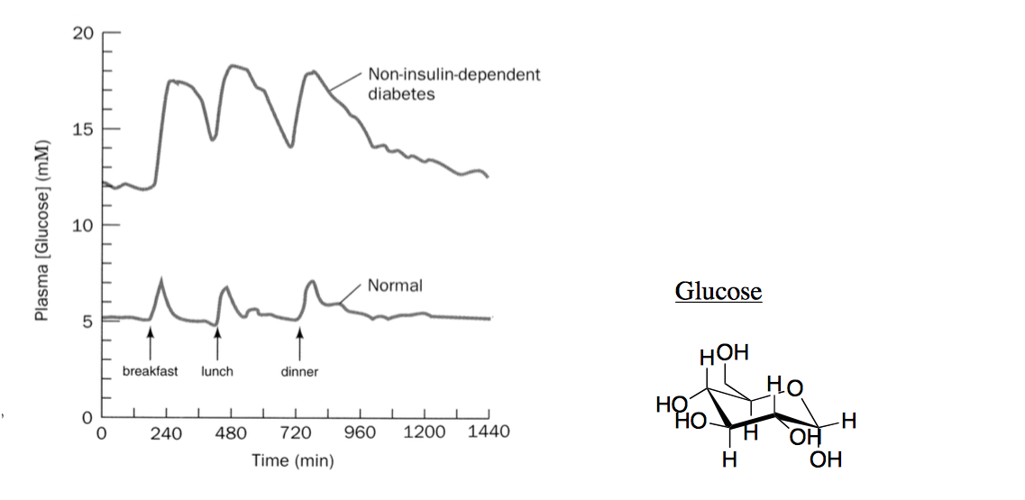 normal control has fasting levels around 5mM and small rapid spikes of blood glucose after meals.