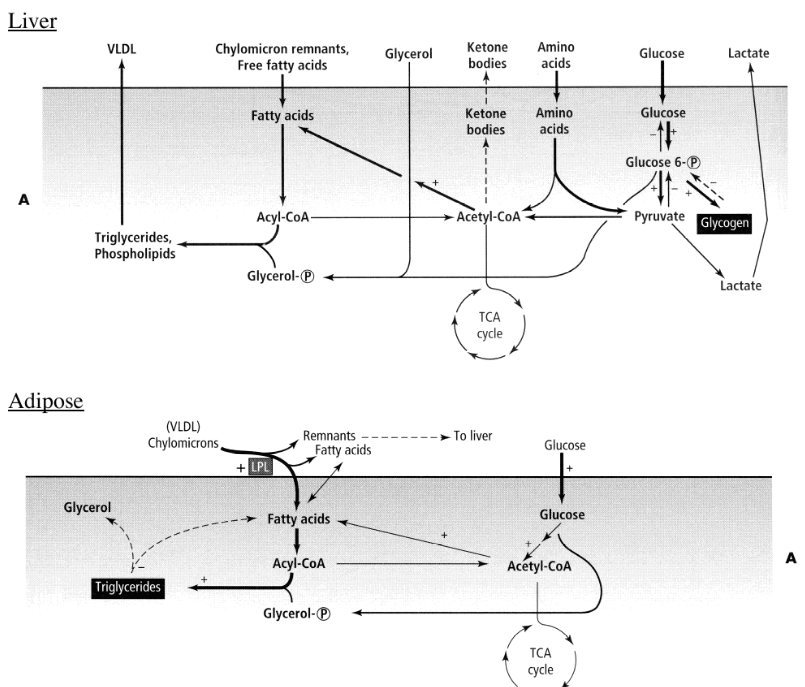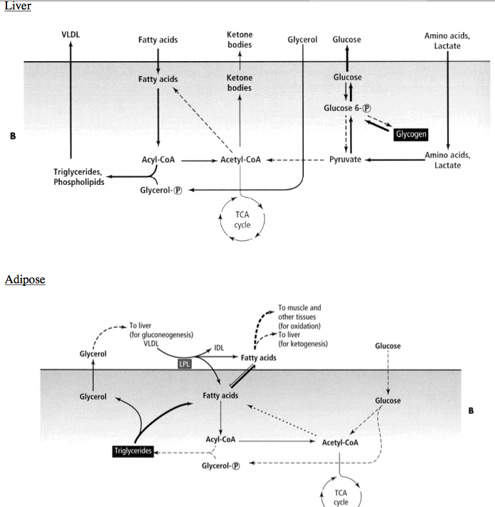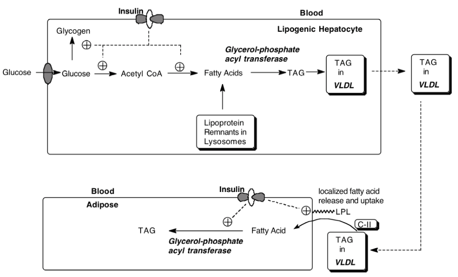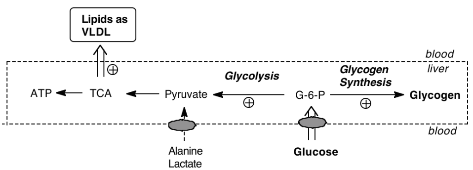 In the well fed state, insulin stimulates the liver to make fatty acids from glucose obtained from the diet by binding to receptors on the cell surfaces of the liver and adipose which causes activation of key metabolic enzymes that catalyze rate determining steps.