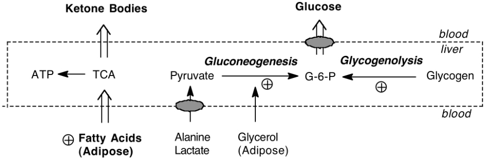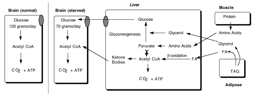 Results: Adipose continues to release free fatty acids to blood. liver uses free fatty acids to make ketone bodies. But brain still needs about 6g glucose/hour. The liver is out of glycogen. Only source of glucose is gluconeogenesis in liver. Carbon sources for gluconeogenesis are amino acids, lactic acid and glycerol (from breakdown of TAG).