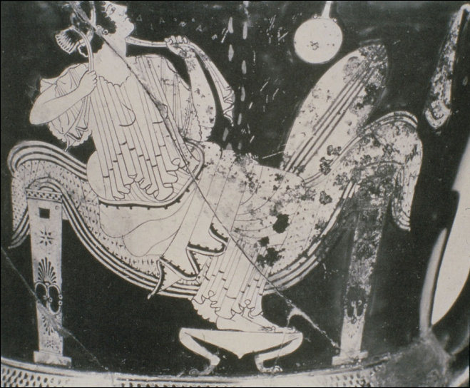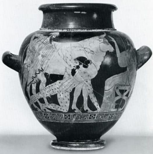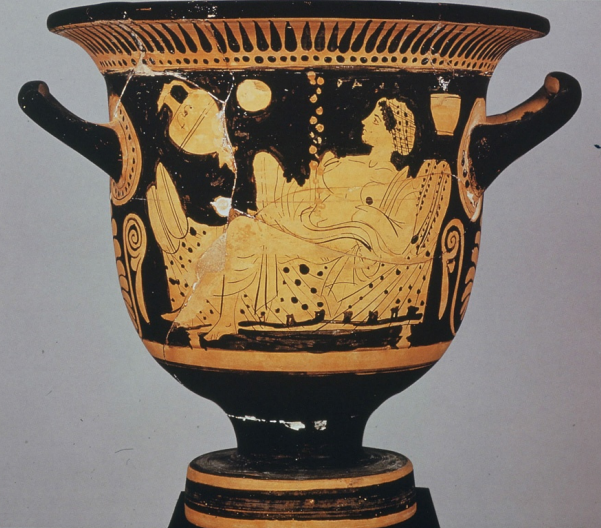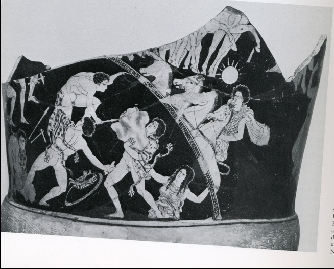 Giants attempt to climb Mt. Olympus (gigantomachy), Gaia is rising from below. As the sun rises (Helios in his quadriga), the gods are readying themselves for battle (legs of horses from chariot of one of the gods). Red figure krater in Naples, National Museum. C. 390 BC.