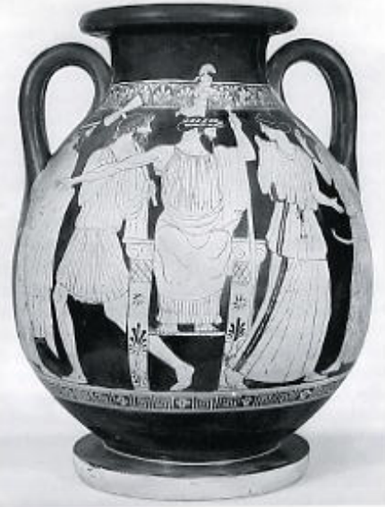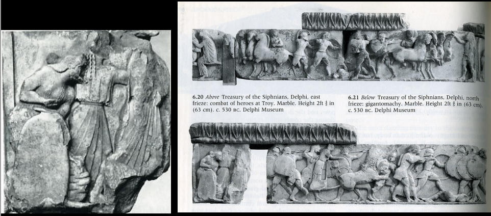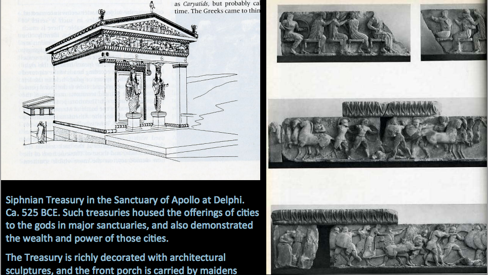 Siphnian Treasury in the Sanctuary of Apollo at Delphi. Ca. 525 BCE. Such treasuries housed the offerings of ciFes to the gods in major sanctuaries, and also demonstrated the wealth and power of those ciFes. The Treasury is richly decorated with architectural sculptures, and the front porch is carried by maidens instead of columns. The north frieze shows the fight between gods and giants (gigantomachy). The names of the gods and giants were inscribed below them: Hephaistos, Dionysos, Themis, Apollo, Artemis.