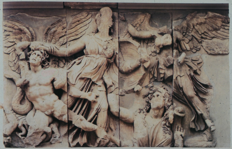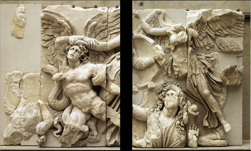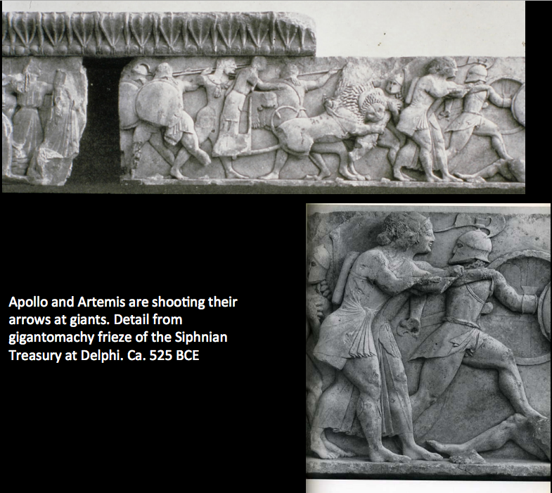 Apollo and Artemis are shooFng their arrows at giants. Detail from gigantomachy frieze of the Siphnian Treasury at Delphi. Ca. 525 BCE
