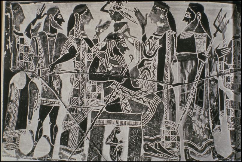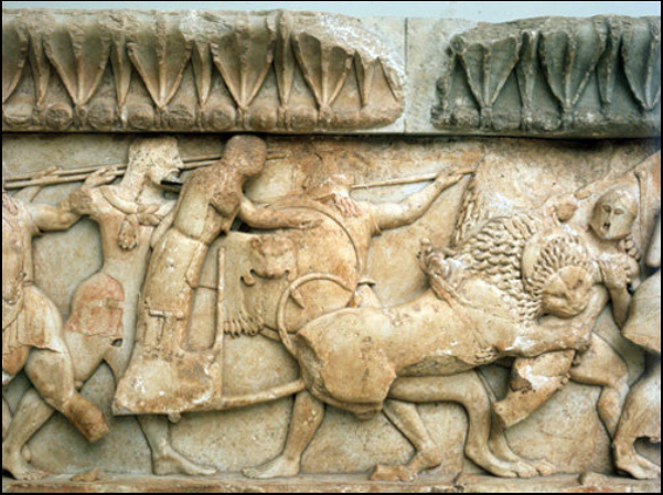 Siphnian treasury, north frieze. Themis in her chariot drawn by a lion. Behind her, Dionysos (with animal skin). The lion attacks the Giant/ hoplite whose face is depicted in frontal view. The negative light in which hoplite warfare is shown on the North frieze may have to do with the aristocratic outlook of the Siphnian patrons of the Treasury