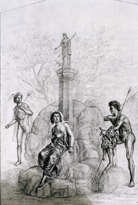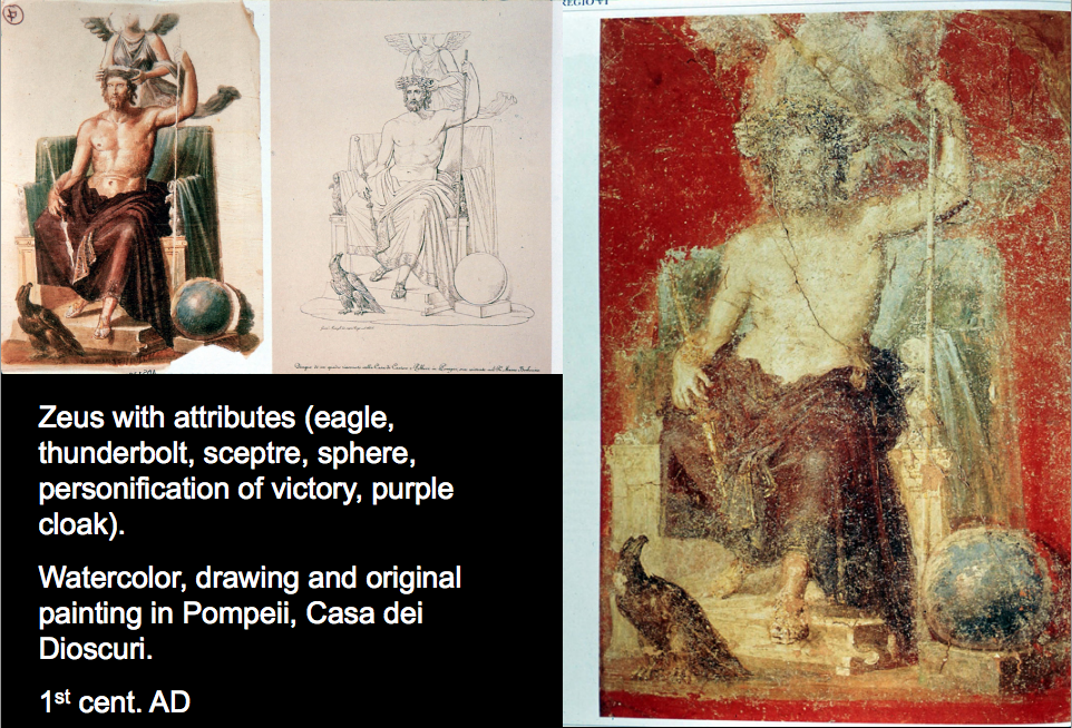 Zeus with attributes (eagle, thunderbolt, sceptre, sphere, personification of victory, purple cloak). Watercolor, drawing and original painting in Pompeii, Casa dei Dioscuri. 1st cent. AD