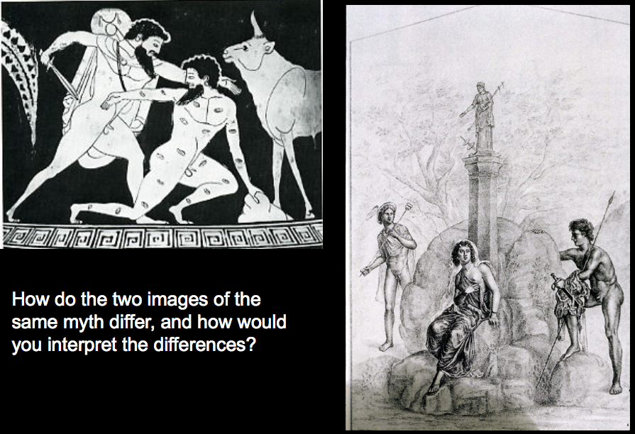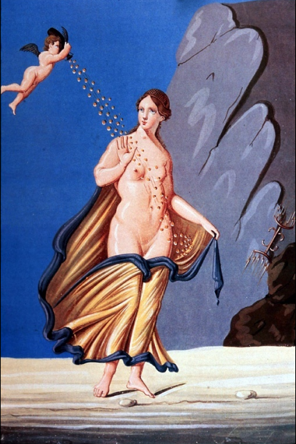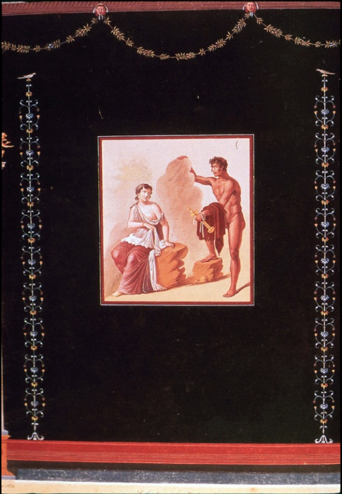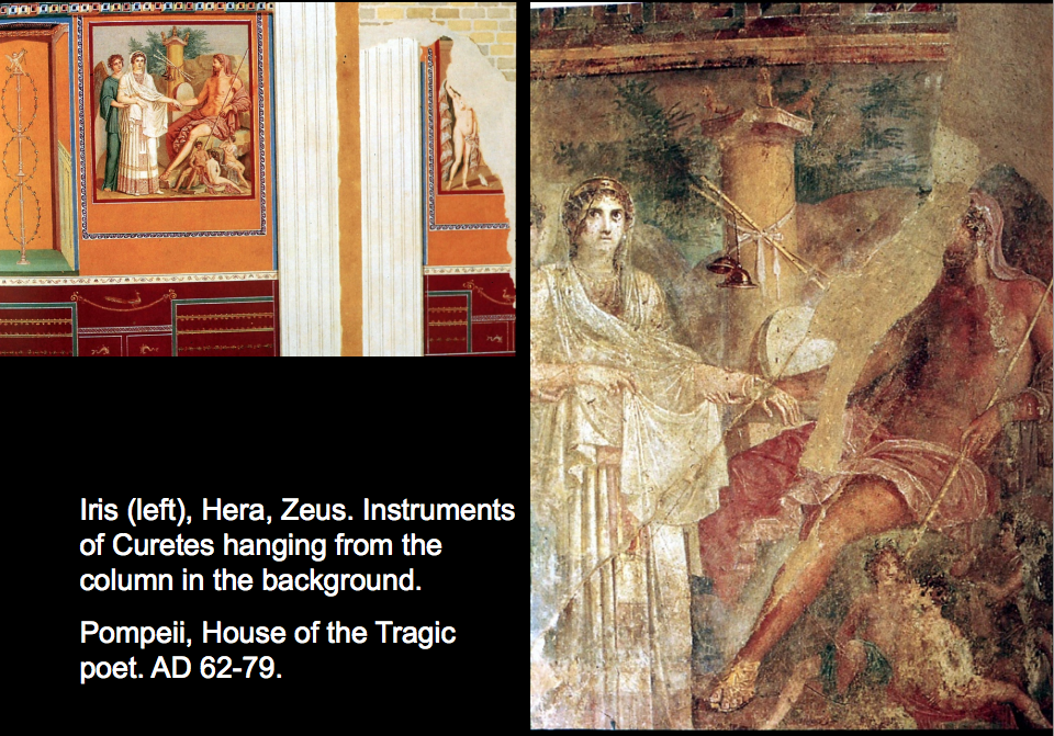 More unusual representation. Roman wall painting. Zeus upper body bare, sceptre. Sacred instruments in background