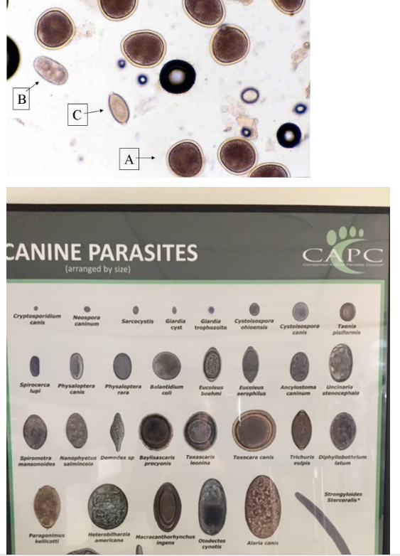 Identify the ova in this canine fecal sample. You may use the reference provided in this question. (Hint: assume 40x objective for this degree of clarity)