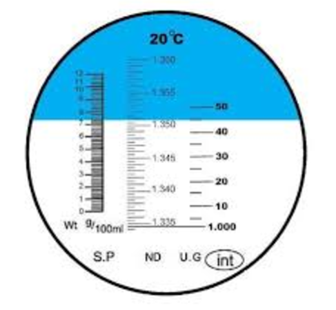 What is the specific gravity of this urine sample as read on the refractometer below?