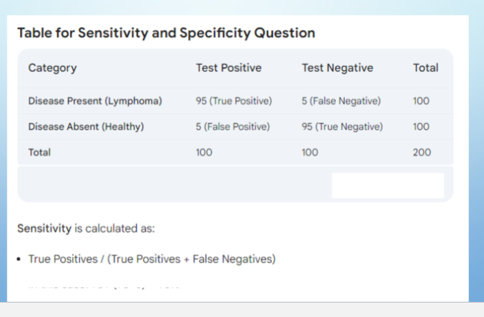 A new blood test for canine lymphoma has been developed. In a study of 100 dogs with confirmed lymphoma, the test was positive in 95 dogs. In a separate study of 100 healthy dogs, the test was positive in 5 dogs.