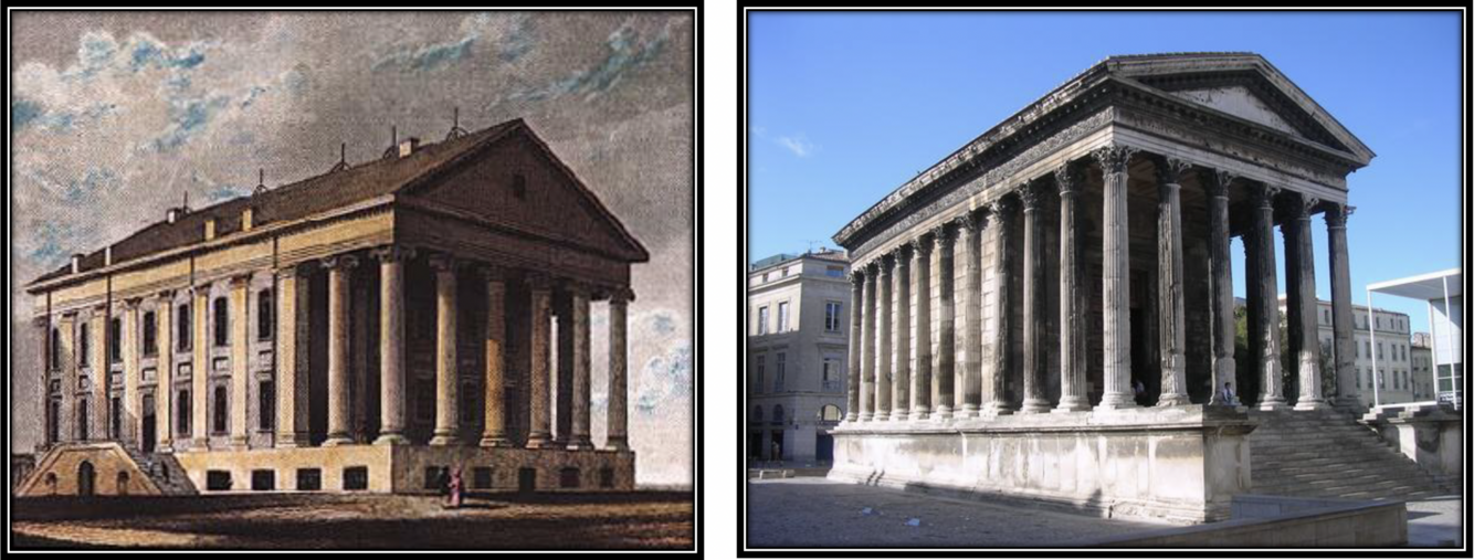 An early rendering of the Virginia State Capitol and La Maison Carrée , 16 BC, Nimes, France. One of the most well preserved Roman temples in the world.