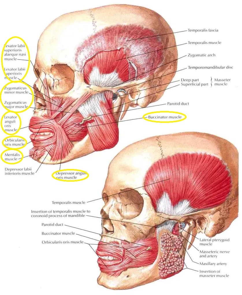 orbicularis oris, zygomatic major/minor, superior levator labii, mentalis, risorius, caninus, depressor anguli