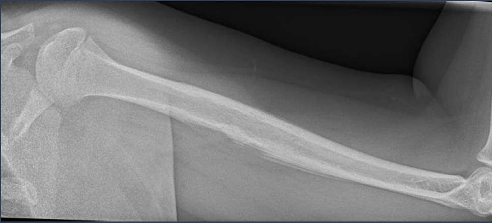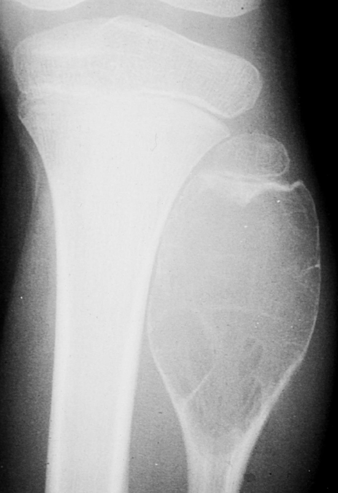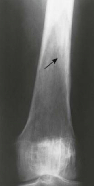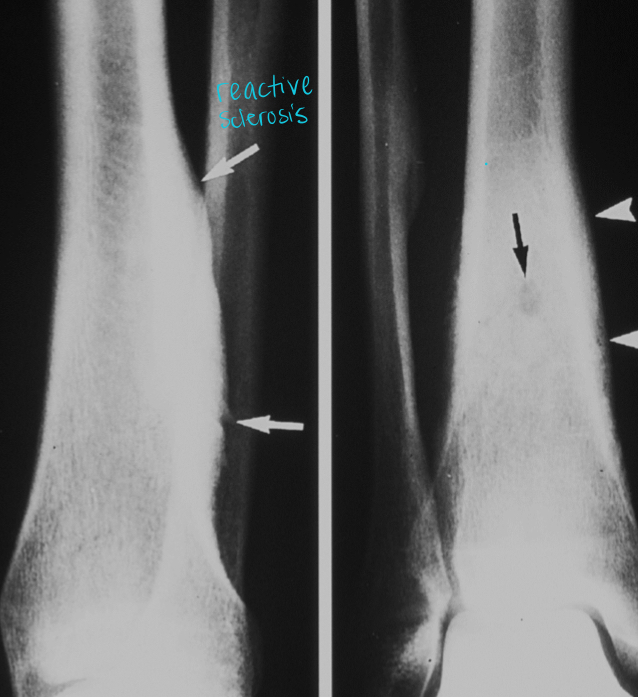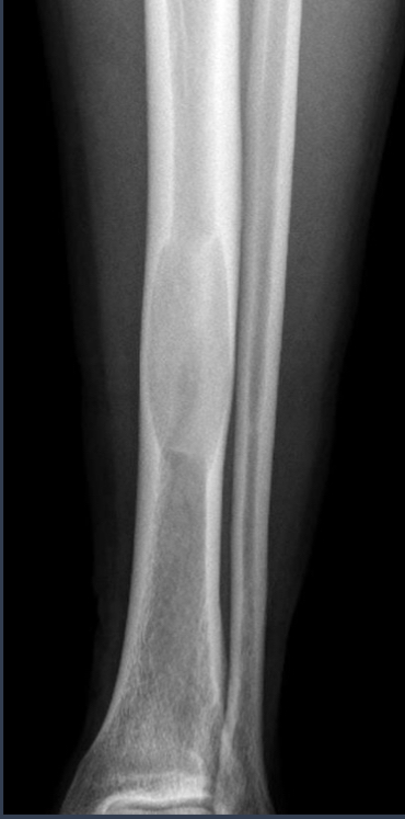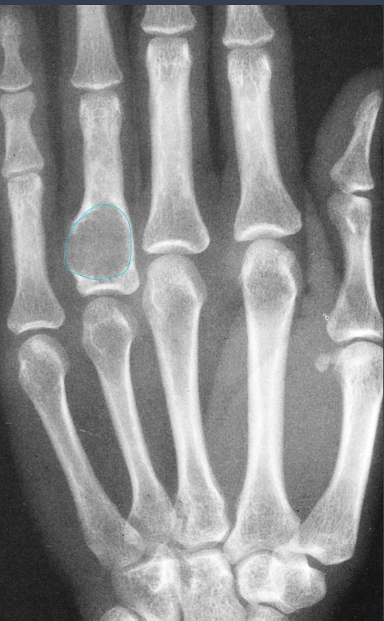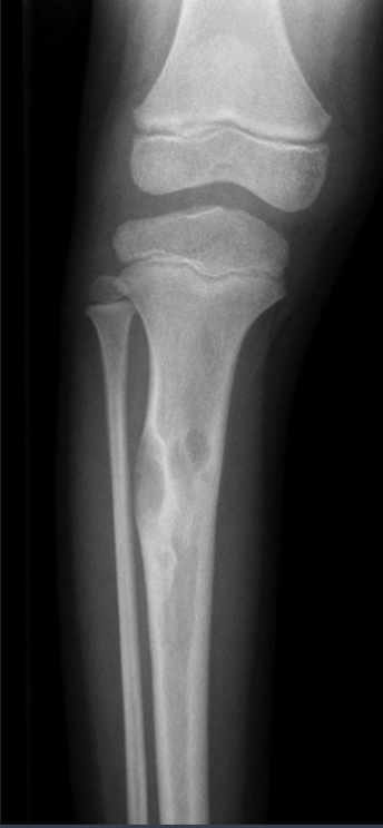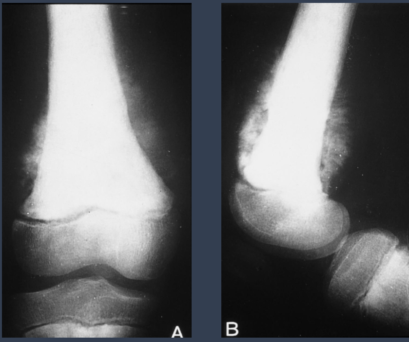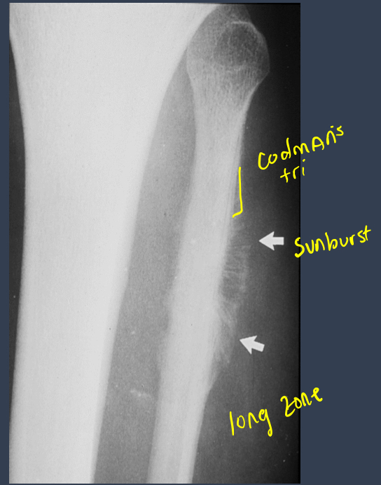 metaphyseal, can extend to epiphysis ITS THE ONLY BENIGN TUMOR TO CROSS GROWTH PLATE
