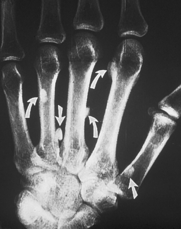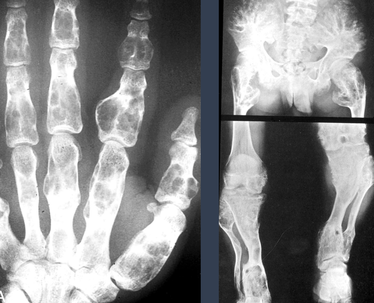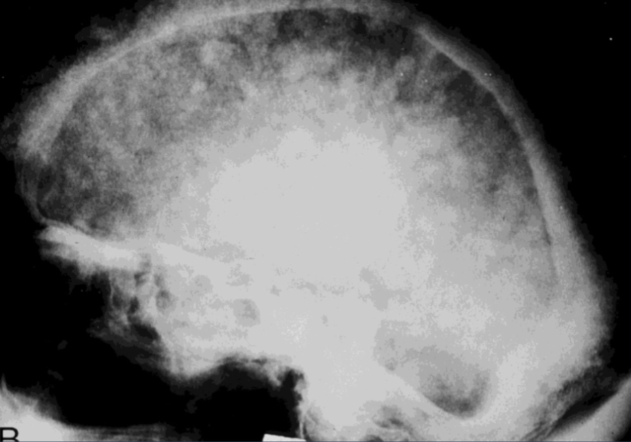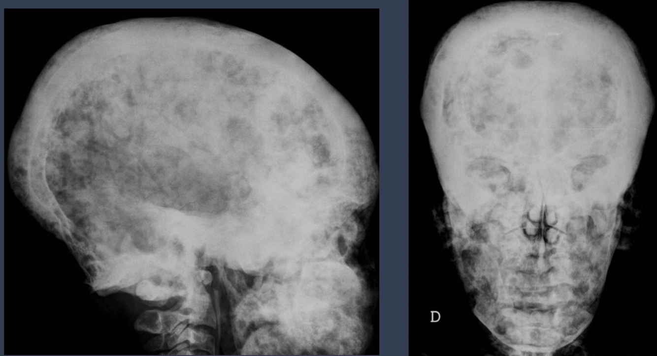 cotton wool appearance basilar impression (tip of the odontoid process projects above the foramen magnum)