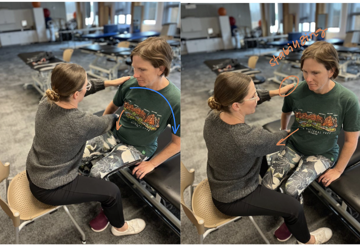 manual application of force away from the axis of motion at the joints as patient is asked to move or to stabilize