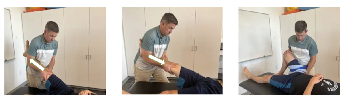 proximal hand on posterior GT applying anterior force as other hand passively ERs the limb