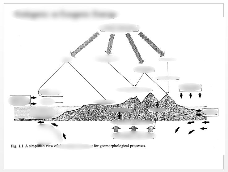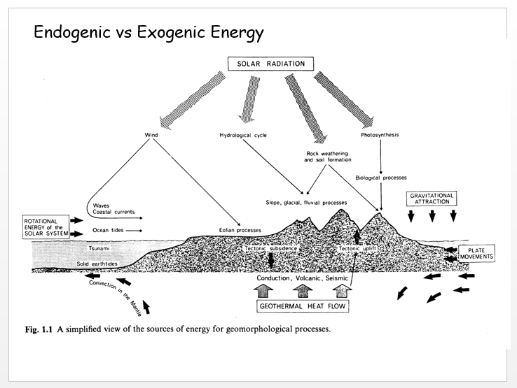 Exogenic vs endogenic sources of energy generate different sets of processes and contribute to different systems. Typically, exogenic sources of energy serve to promote planation, or the flattening of the landscape, through weathering, erosion, and other processes. Systems of wind, rainfall, weathering, and biological weathering like growth of roots can all be traced back to energy provided by the sun. Endogenic sources, on the other hand, usually serve to increase the relief of the landscape and generate new features in what’s termed uplift. Examples of endogenic processes would be volcanism or plate tectonics. These processes source their energy from the decay of radioactive materials or from the primordial heat of the earth.