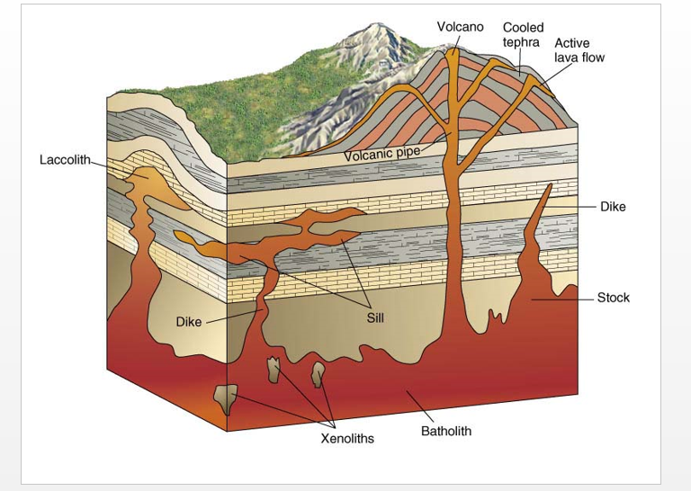 Volcanism is an umbrella term for the movement of magma from the asthenosphere and mantle upwards towards the crust and surface of the earth. This magma can infiltrate into various layers of rock far into the crust, leaving intrusions of foreign igneous rock. The magma chamber, or batholith, is the area below the solid layers of crust where the rock is primarily in the form of magma. This magma can flow up to form diverse structures like laccoliths, dikes, or other intrusions.