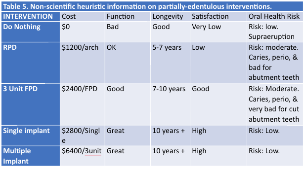 what would a common heuristic outline of prosthetics would look like for no treatment, RPD, 3-unit FPD, single implant, and multiple implants? include cost, function, longevity, satisfaction, and oral health risk