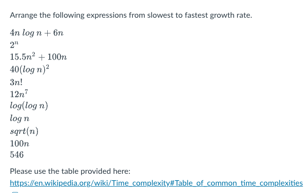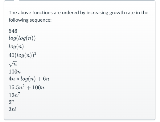 Arrange the following expressions from the slowest to fastest growth rate.