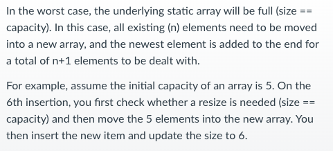 When do we need to increase the capacity of the underlying data storage array (i.e. data) in order to make space for the new element.