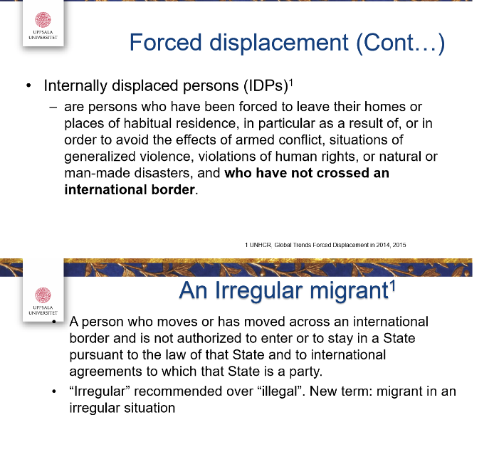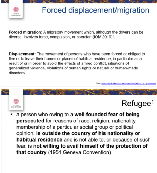 Fördrivning = man blir bortdriven pga man är tvungen att fly, från sin bostadsort, pga att undvika effekter av krig, våld, överträdelser av mänskliga rättigheter eller pga naturkatastrofer.