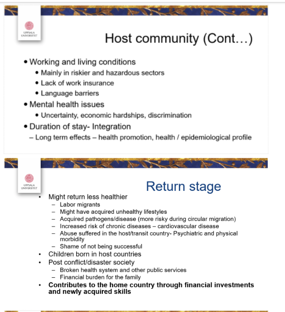 - Hälsosystemets utmaningar - är att träna sjukvårdens personal inom värdlandet på vad det kan innebära för häslan hos en migrant, språkbarriärer, att migranten kanske inte litar på vården pga tidigare erfarenheter. Man behöver också tänka på kontexten av vilket land man kommit ifrån - t.ex. litar man på staten?