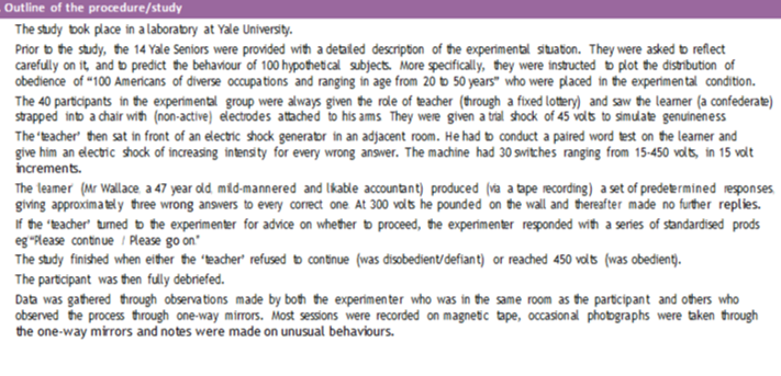 In Milgram’s study they were tested at Yale university in a lab type setting with an unfamiliarauthorityfigure asking them to carry out an unfamiliar task-giving electric shocks to a stranger in response to a word task. The task and environment could be said to be unreflective of obedience in real life.