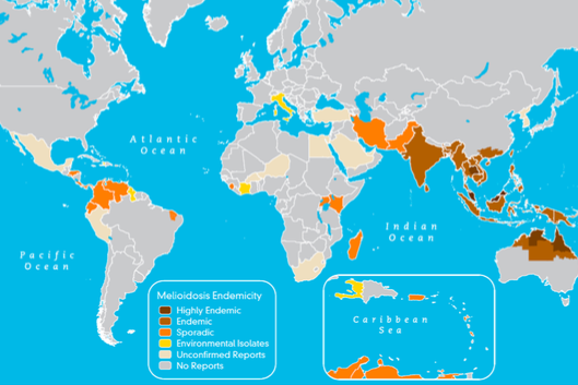 What are the important properties, epi, and transmission of Burkhoderia pseudomallei (meliodosis or Whitmore’s disease)?