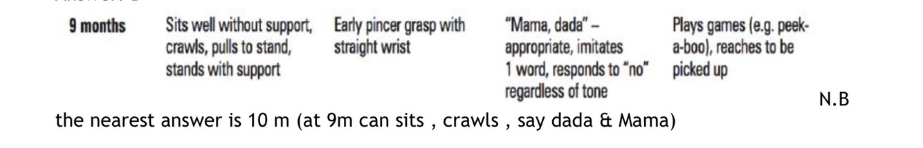 Baby sit briefly, crawl , move object from hand to hand , but can’t do pincer grasp A. 4 month
