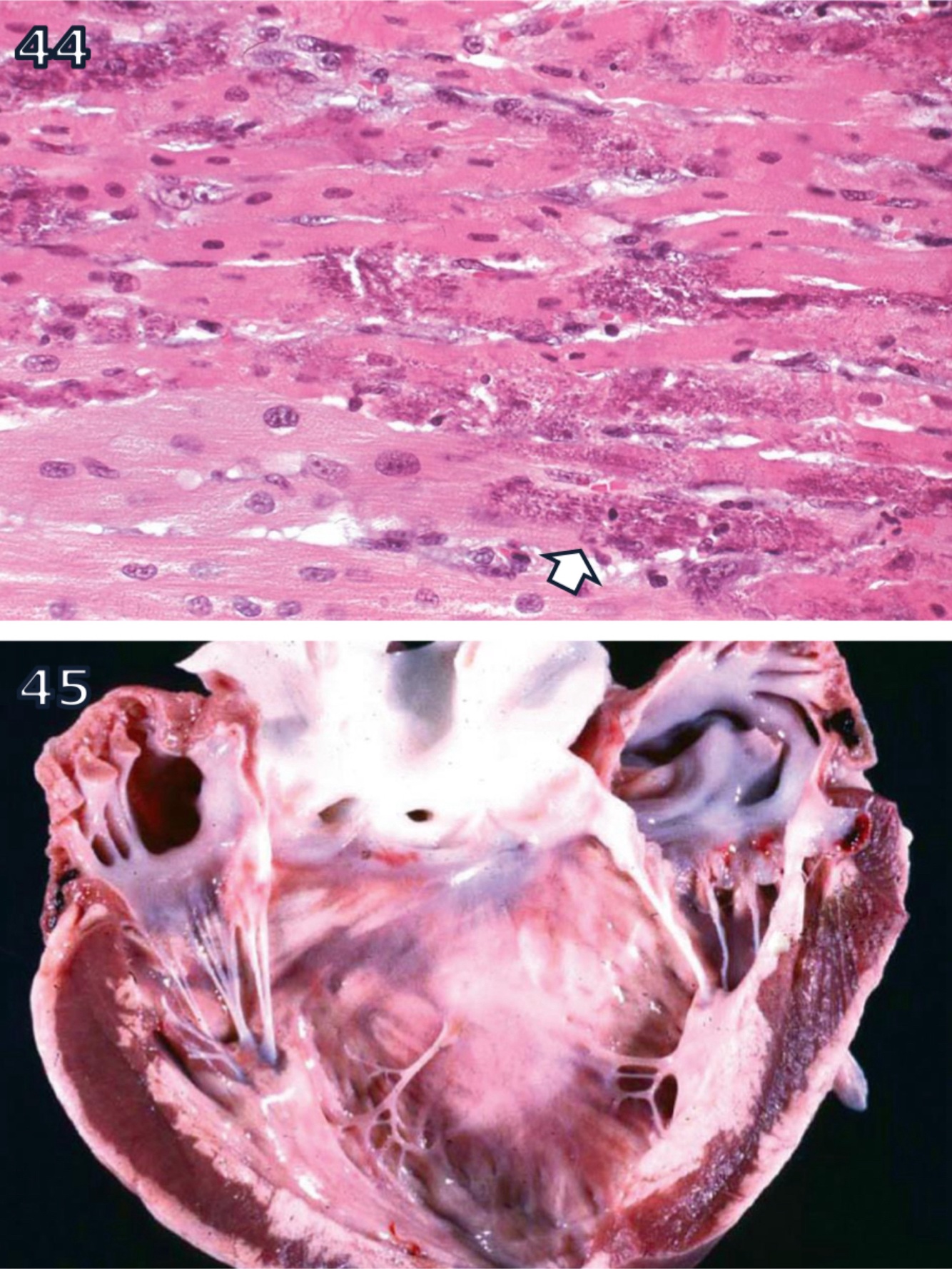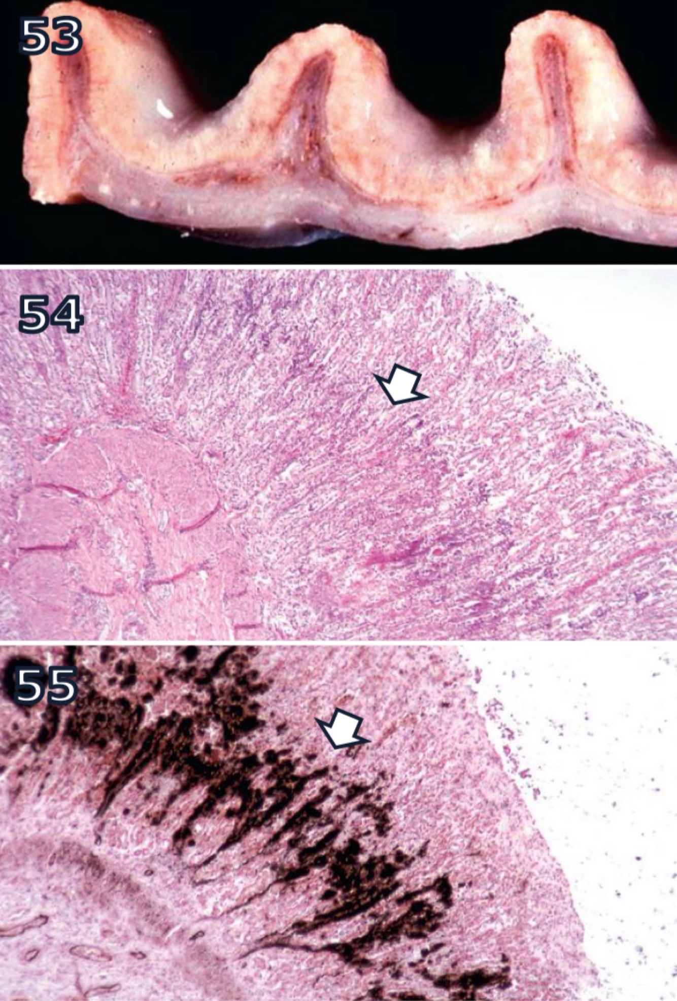 calcification is gross lesion for which myocardial + skeletal muscle necrosis of vit. E or selenium deficiency in ruminants (white muscle dz)