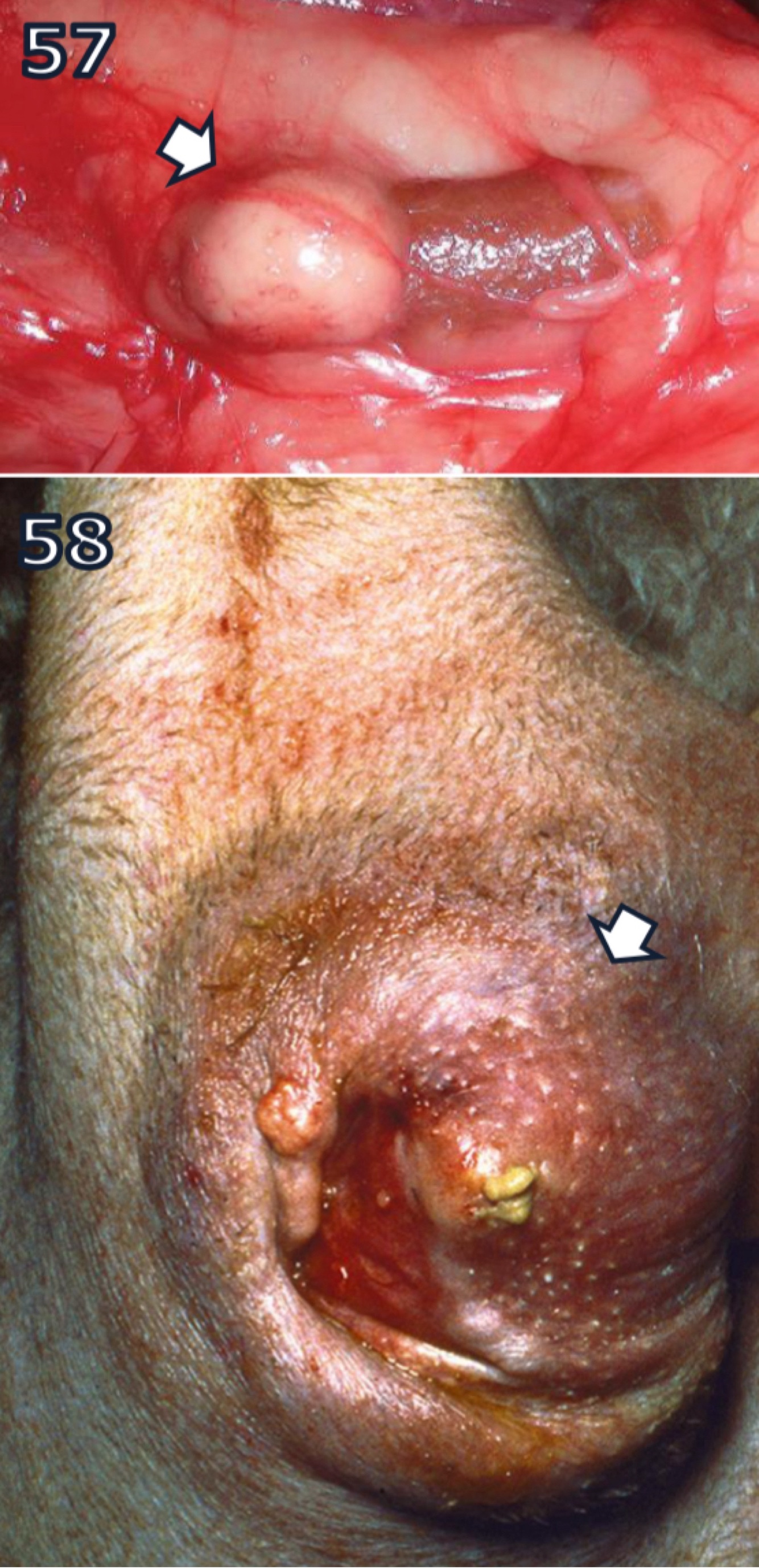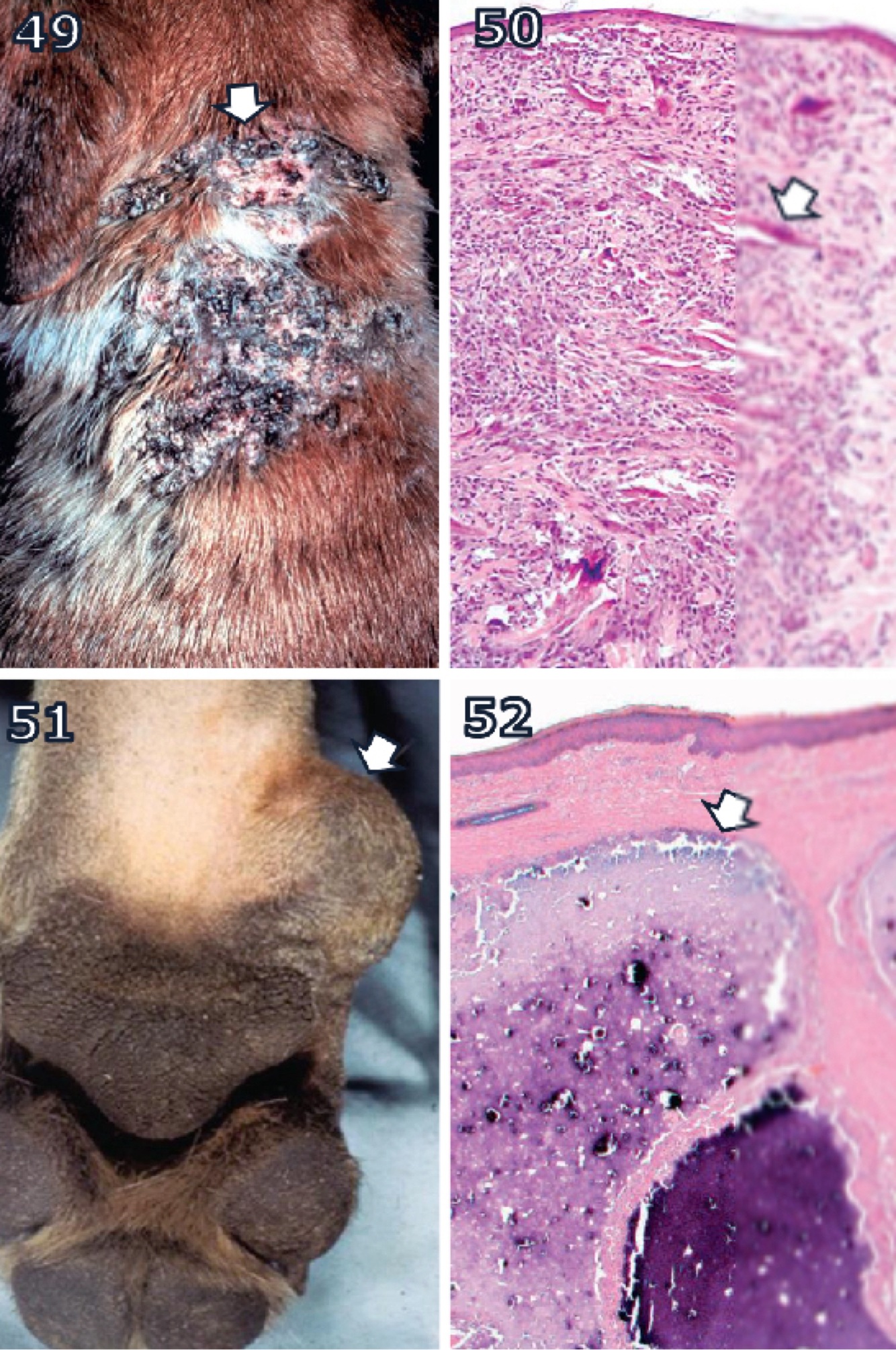 - common over bony prominences of distal limbs in young dogs of large breeds