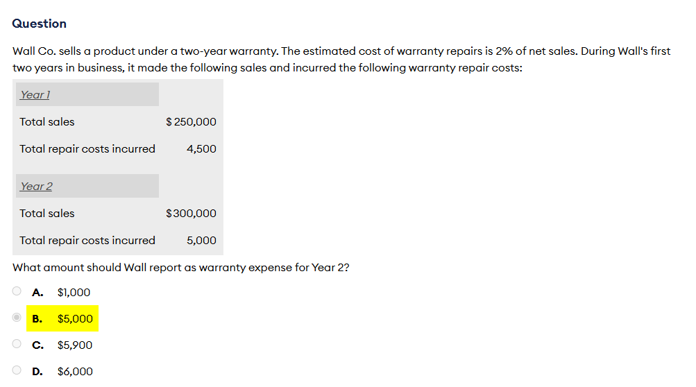 Choice “D” is correct. Under accrual accounting, the entire warranty liability must be accrued in the year of the sale to match the warranty cost to the related revenue. The Year 2 warranty expense is $6,000, calculated as follows: