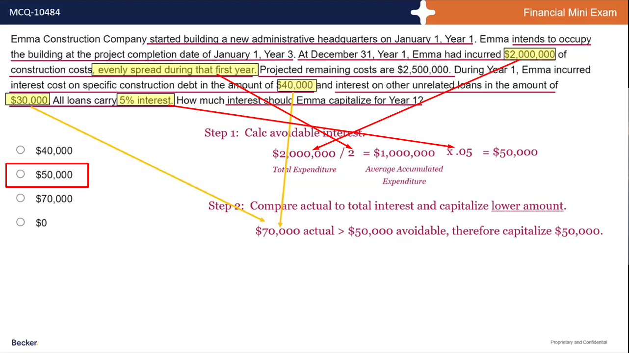 Emma Construction Company started building a new administrative headquarters on January 1, Year 1. Emma intends to occupy the building at the project completion date of January 1, Year 3. At December 31, Year 1, Emma had incurred $2,000,000 of construction costs, evenly spread during that first year. Projected remaining costs are $2,500,000. During Year 1, Emma incurred interest cost on specific construction debt in the amount of $40,000 and interest on other unrelated loans in the amount of $30,000. All loans carry 5% interest. How much interest should Emma capitalize for Year 1?