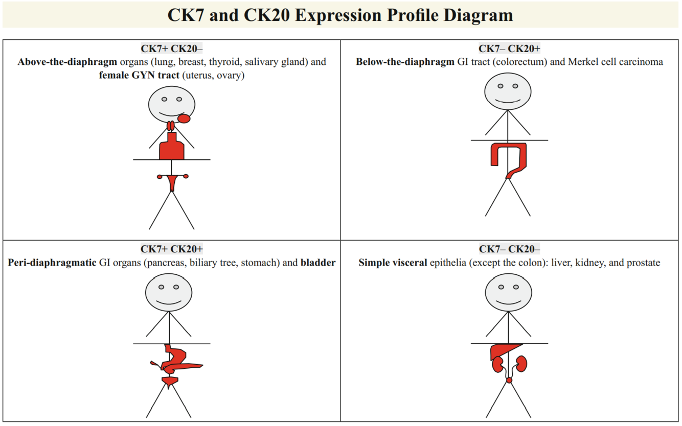 CK7+20- above diaphragm and female gynae, Breast, lung (ca and meso), endometrium, ovary (non-mucinous), thyroid, salivary gland, kidney (papillary RCC)