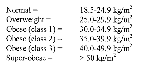 To remember rough estimate…5’ 70kg person = BMI ~31 (5’ is ~ 150cm, which is 1.5m…1.5^2 = 2.25…70/2.25 = 31)