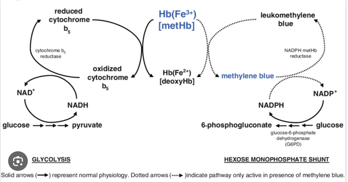 Explain/draw out enzyme pathways relating to MetHb, methylene blue, and G6PD deficiency