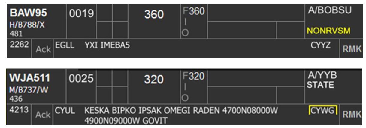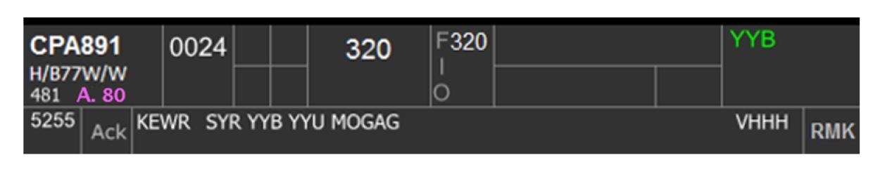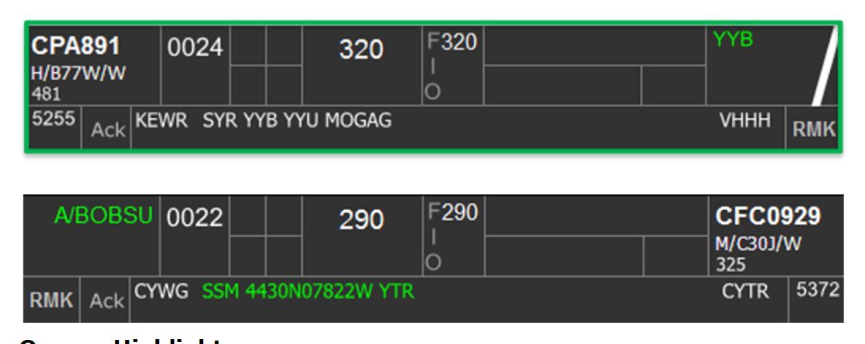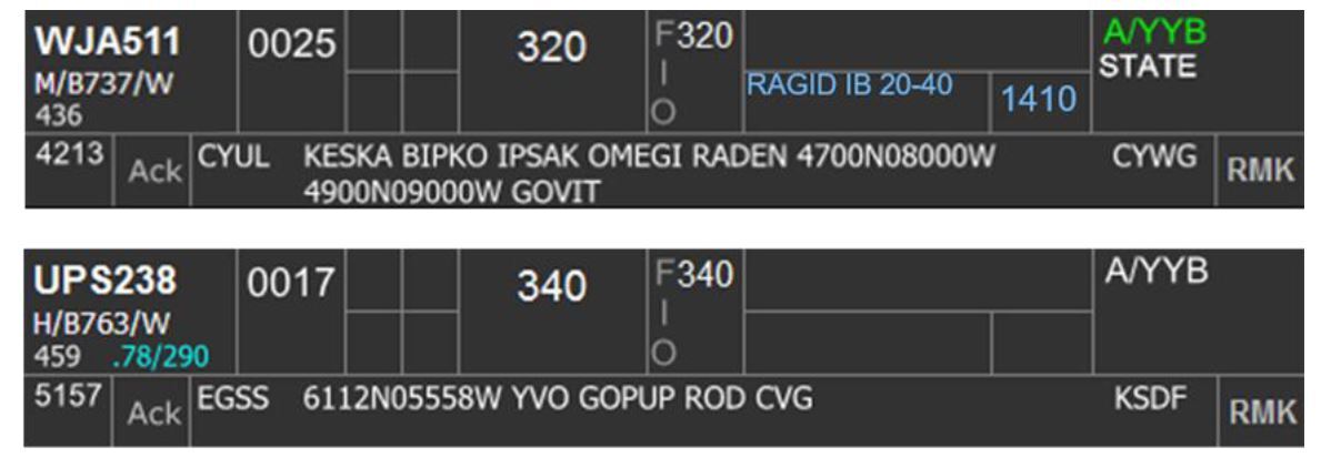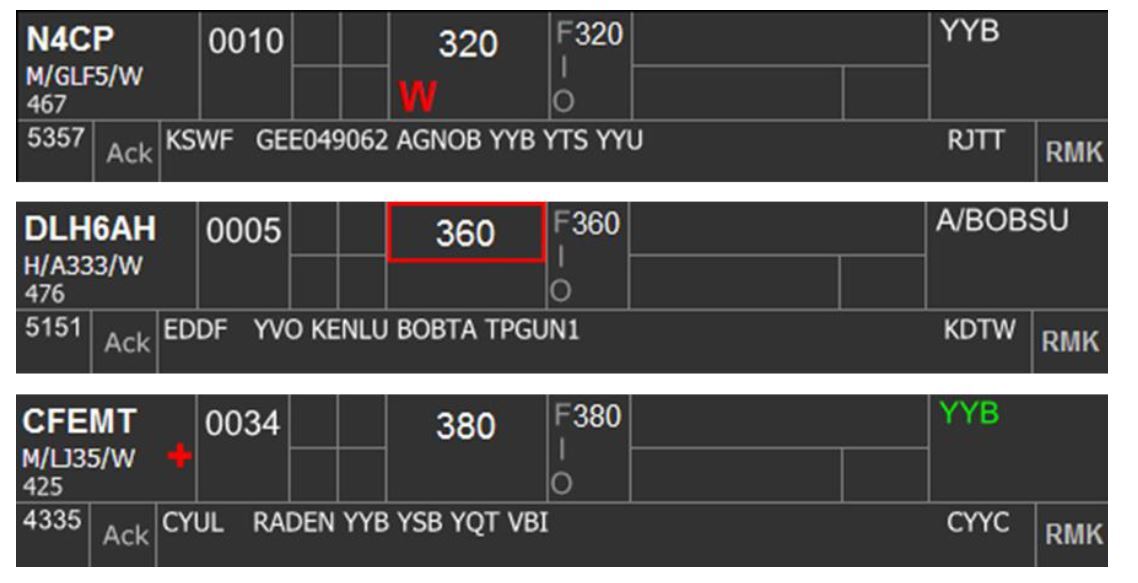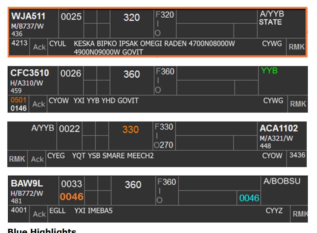 The destination highlight can be toggled on/off by clicking on Box 6B. This highlight is used primarily on personal preference but helpful to use as a reminder of flight that arrive at an underlying airport and require descent as per procedure. Some examples include arrivals to CYYB, CYQA, and CYTR.