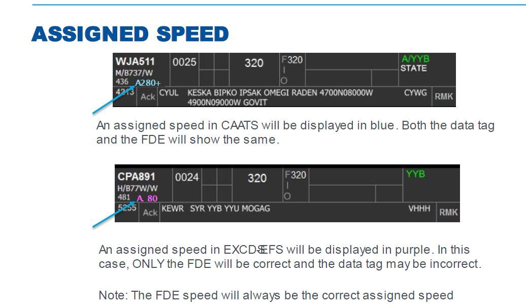 NOTE: if there is a discrepancy between CAATS speeds and the EFS Speed, the speed in purple will be what the aircraft has because if the last speed was assigned in CAATS it would have overwritten the EFS speed etc. So a puple speed will always be the last speed assigned to the aircraft