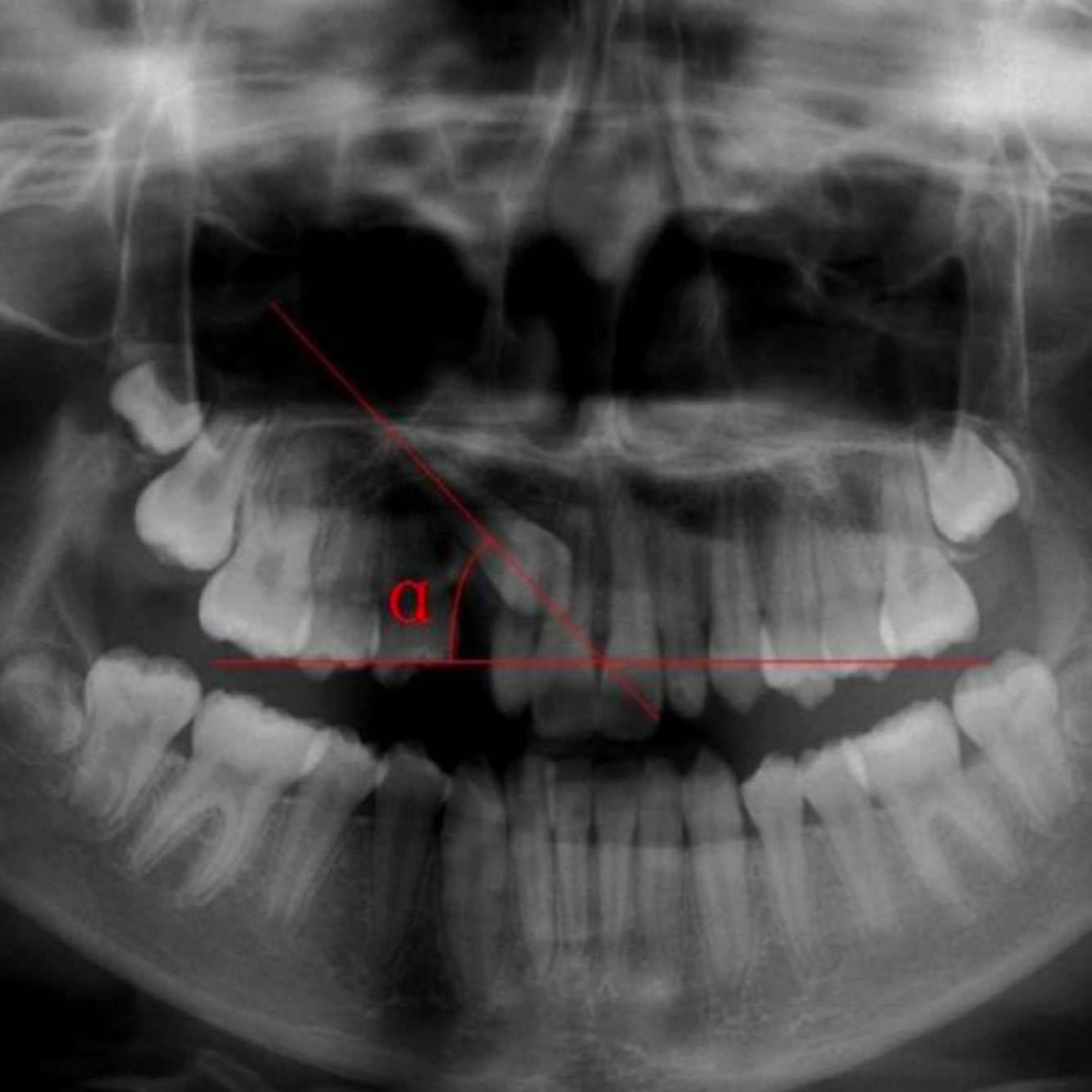 Panormic: angulation of the canine to the occlusal plane is measured. If > or equal to 65 deg, canine is 26x more likely to be labially impacted