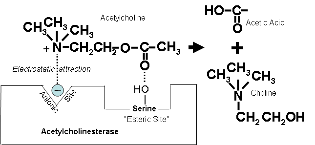 positively charged nitrogen in the acetylcholine molecule is attracted to the ionic site on acetylcholinesterase, and hydrolysis is catalyzed at the esteric site to form choline and acetic acid.