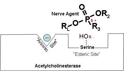 a cholinesterase inhibitor (in this case, a nerve agent) attaches to the serine hydroxyl group on acetylcholinesterase. This prevents acetylcholine from interacting with the cholinesterase