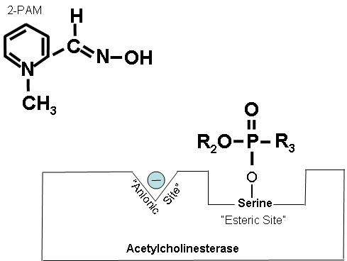 The positively charged quaternary nitrogen on 2-PAM is attracted to the anionic site of acetylcholinesterase. 2-PAM then reacts with and removes the cholinesterase inhibitor. However, this cannot occur after aging has occurred.