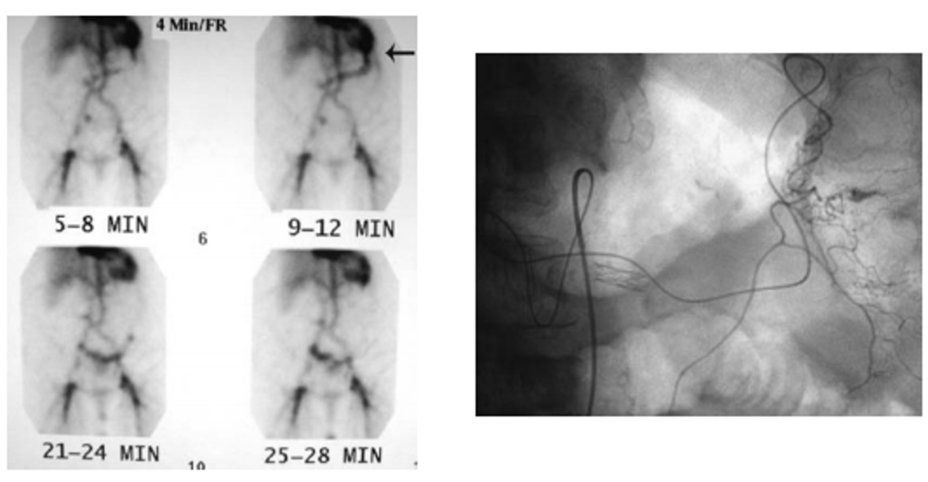 A tagged RBC study demonstrated uptake with migration in the expected region of the left colon nearthe splenic flexure (Fig. 1-1). The patient was then referred urgently for mesenteric angiography.