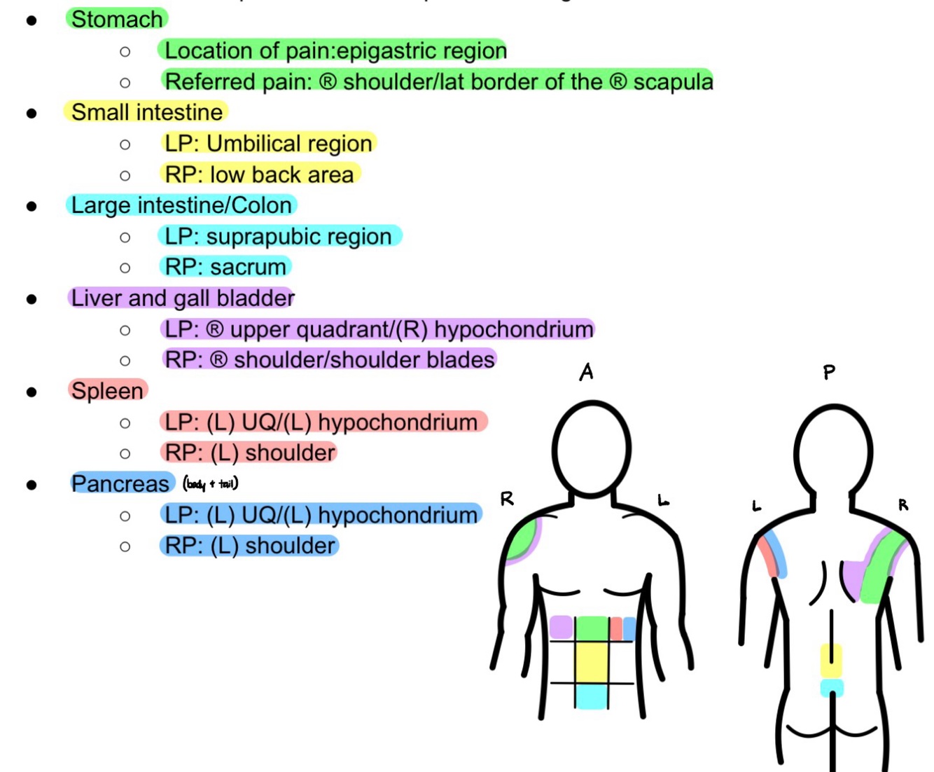 Gall bladder pain = (R) shoulder/shoulder blade
