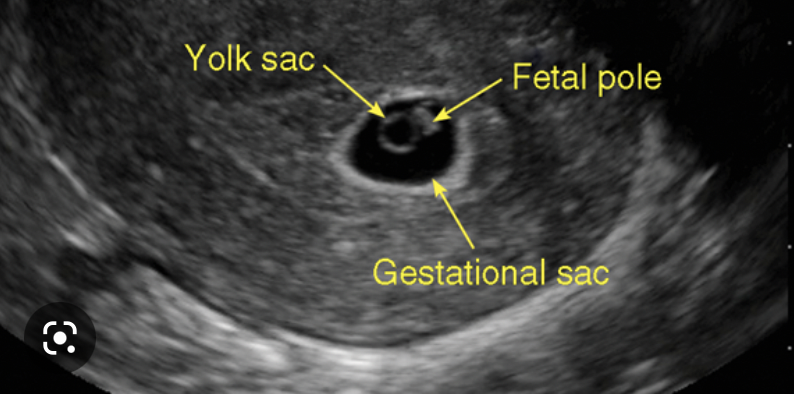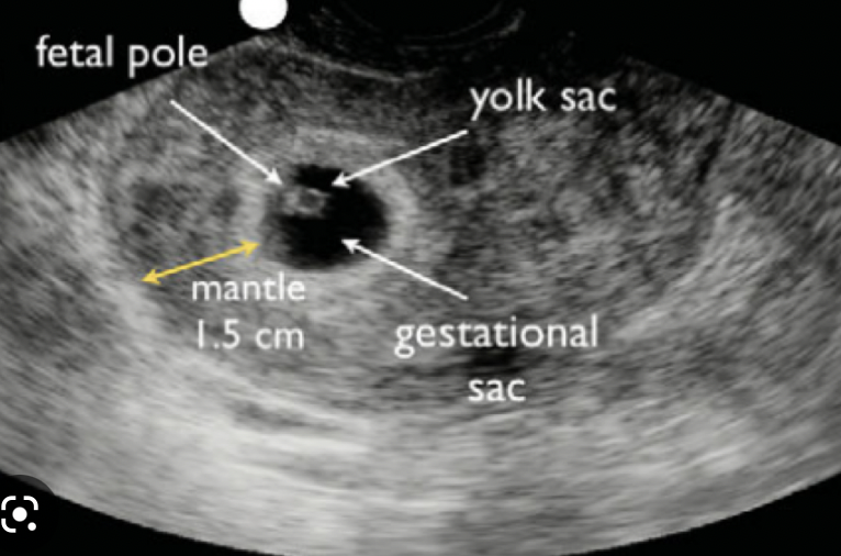 What 3 features are looked for on transvaginal US to determine the viability of a pregnancy?